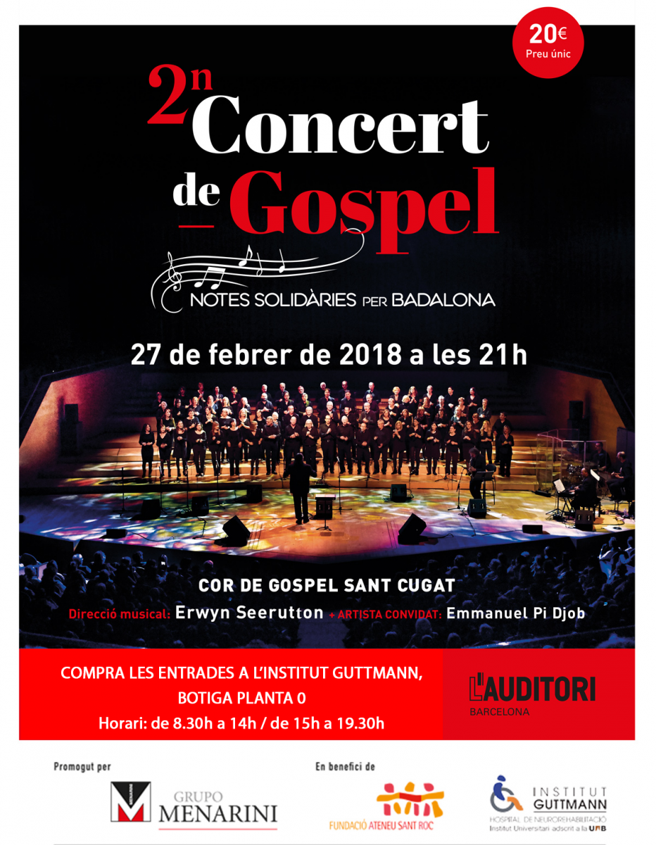 El proper dimarts 27 de febrer a les 21h a l’Auditori de Barcelona (Carrer de Lepant, 150) el Laboratori farmacèutic Menarini celebrarà el 2n Concert de Gospel “Notes solidàries per Badalona”, enguany a favor de l’Institut Guttmann i l’Ateneu Sant Roc de Badalona. El concert serà a càrrec del Cor de Gospel Sant Cugat que interpretarà un repertori de composicions originals del gospel i espirituals negres.