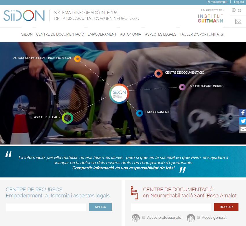L'Institut Guttmann ha posat en marxa el Sistema d’Informació Integral de la Discapacitat d’Origen Neurològic, SiiDON, un portal web que proporciona informació i recursos de gran utilitat relacionats amb el món de la discapacitat d’origen neurològic; des de consells per a la salut, a informació sobre ajudes tècniques, a recursos formatius, docents, idees per al temps lliure, normativa legal, recursos econòmics o fitxes d’infermeria i fisioteràpia, entre d’altres. A més, inclou tots els recursos bibliogràfics digitalitzats del “Centre de Documentació en Neurorehabilitació Santi Beso Arnalot” , per tal de continuar oferint tota la informació científica i divulgativa en torn a la neurorehabilitació i les neurociències.