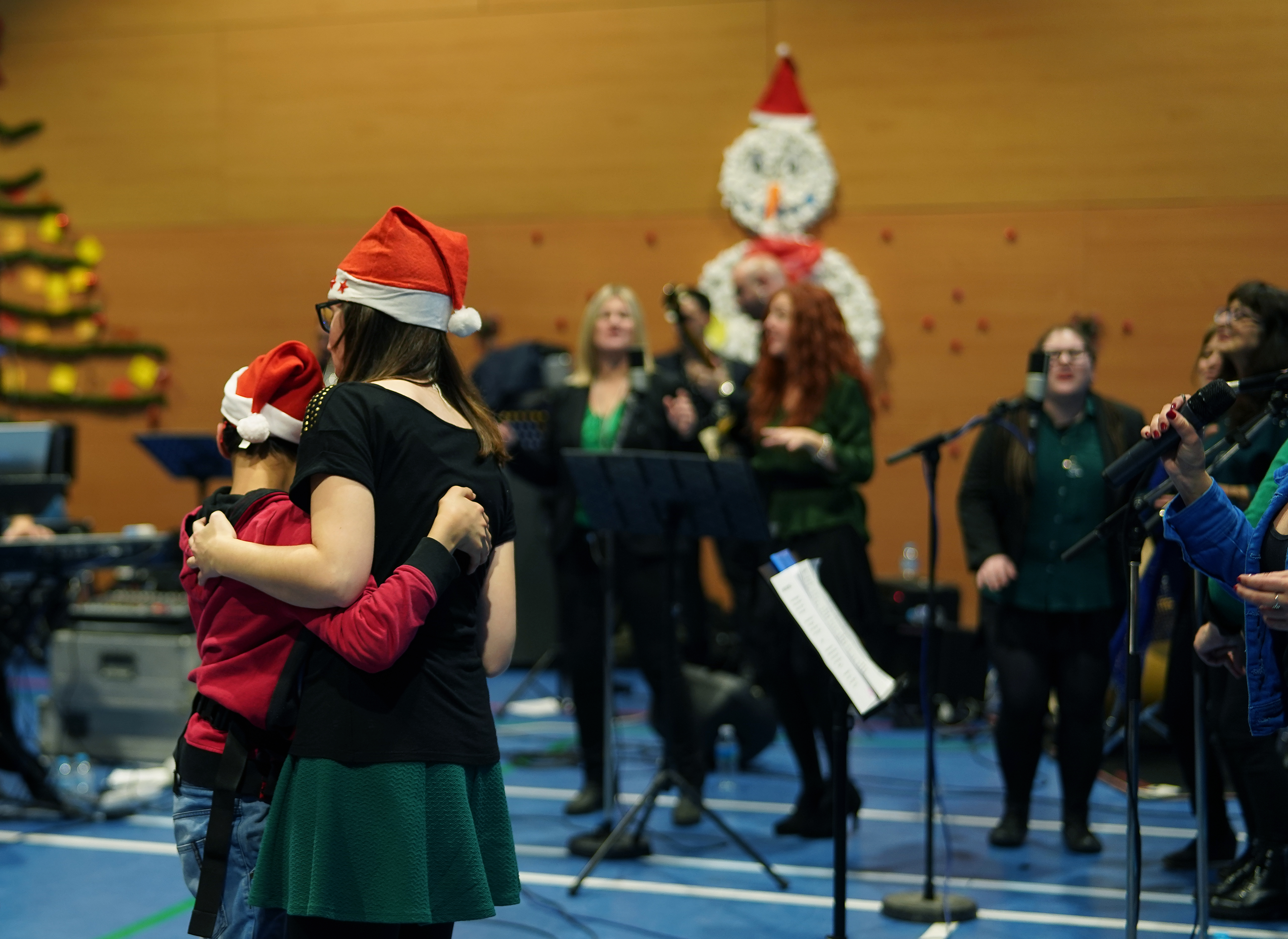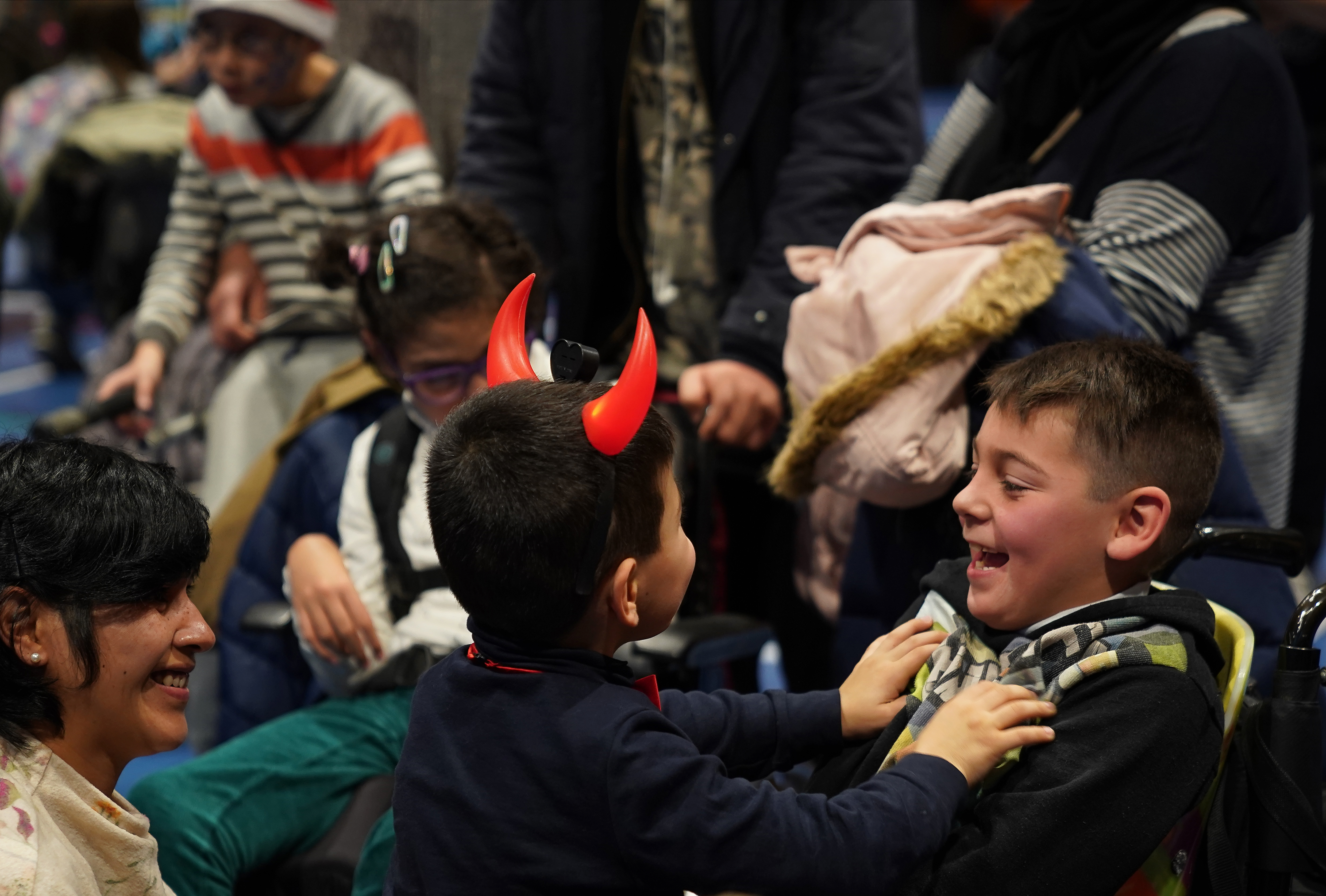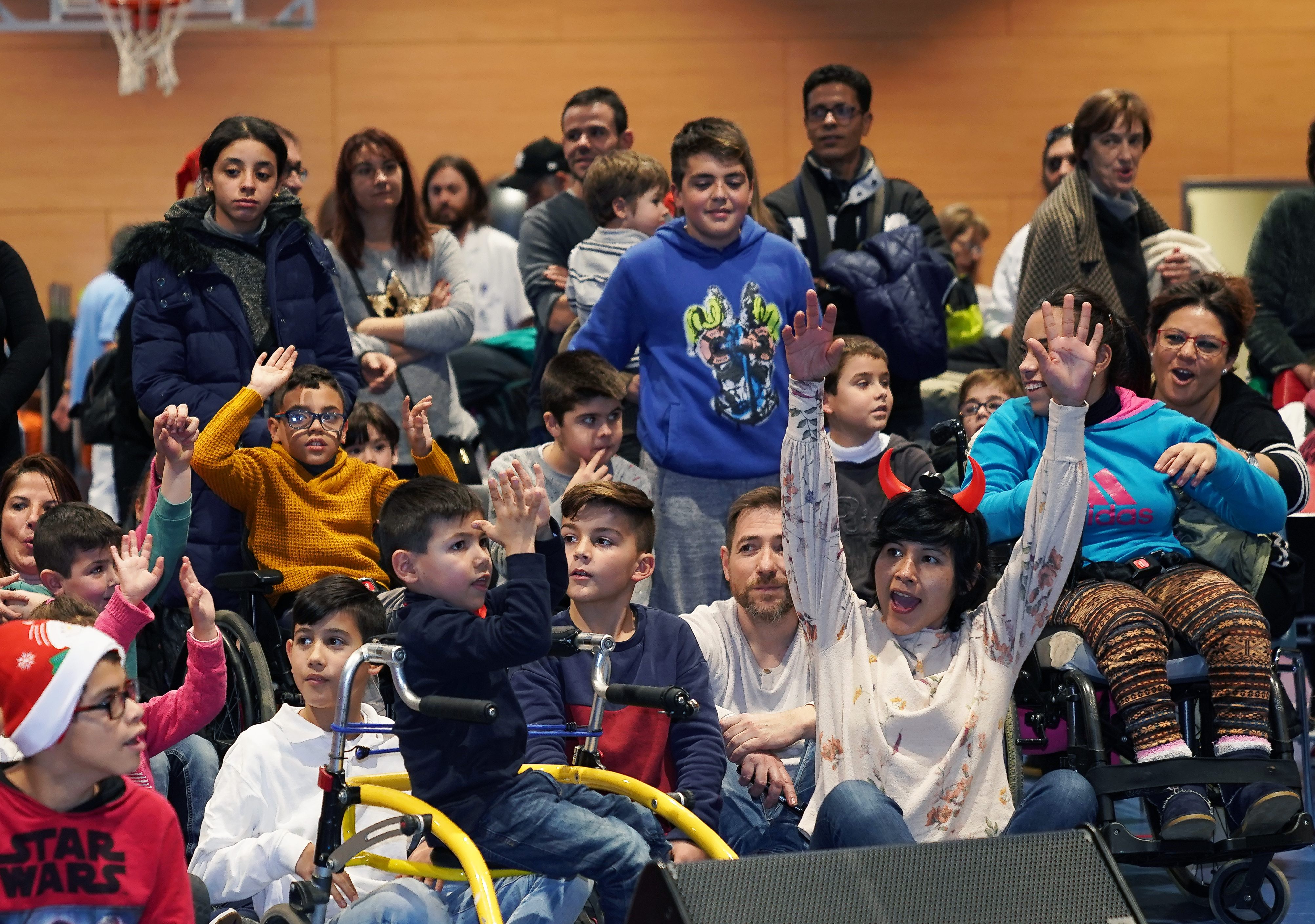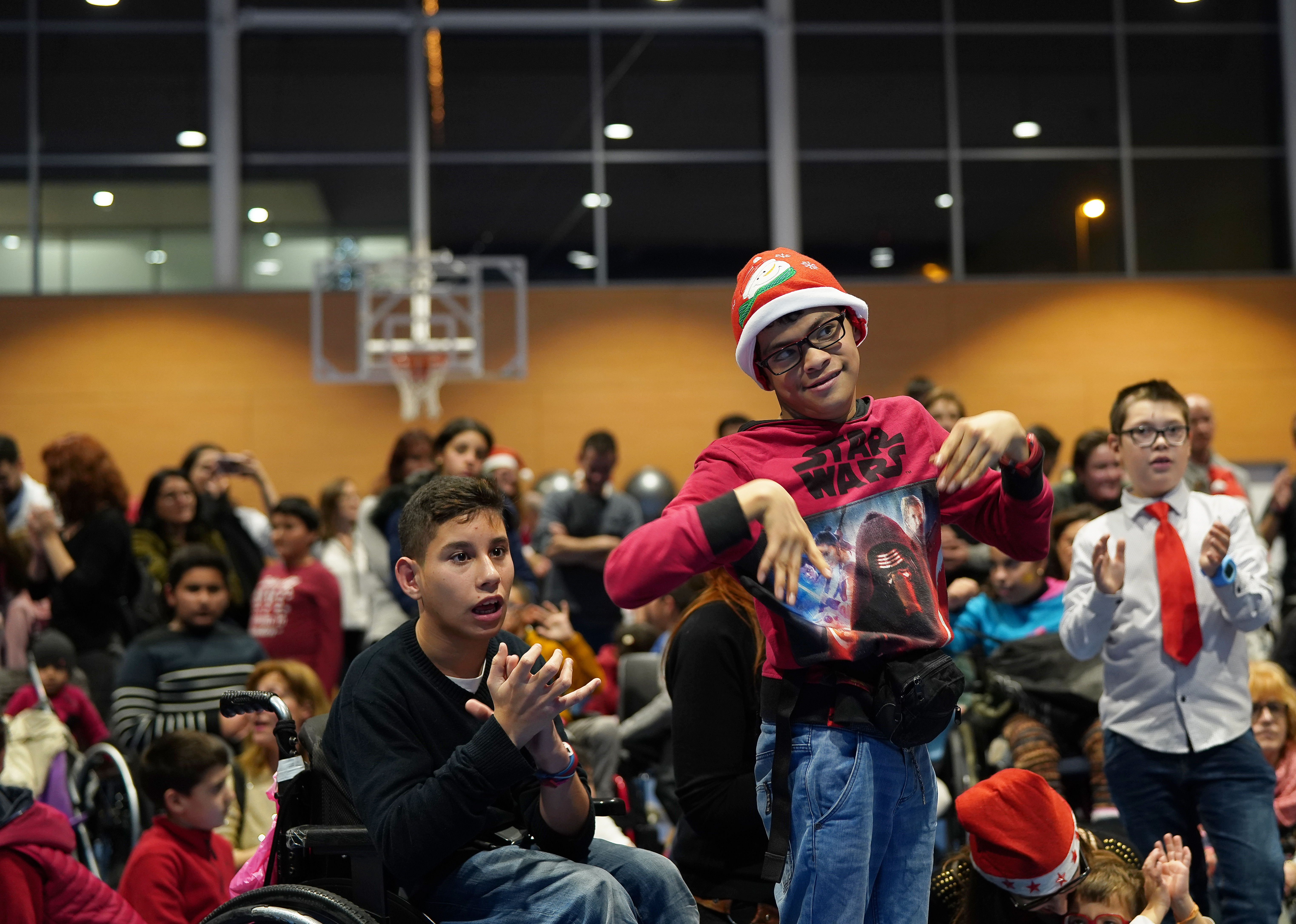 Los más pequeños, pacientes de neurorrehabilitación infantil, llegaron en horario extraescolar para la fiesta. Donde canciones infantiles y villancicos de la coral los pusieron a bailar, y donde después de la chocolatada Papá Noel y el Caga Tió les llenó de regalos e ilusión.